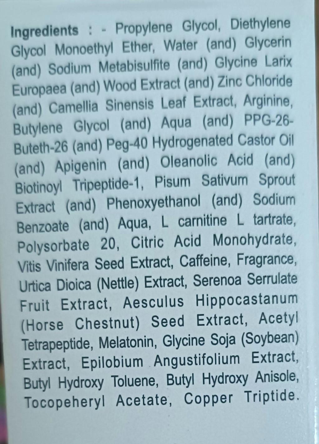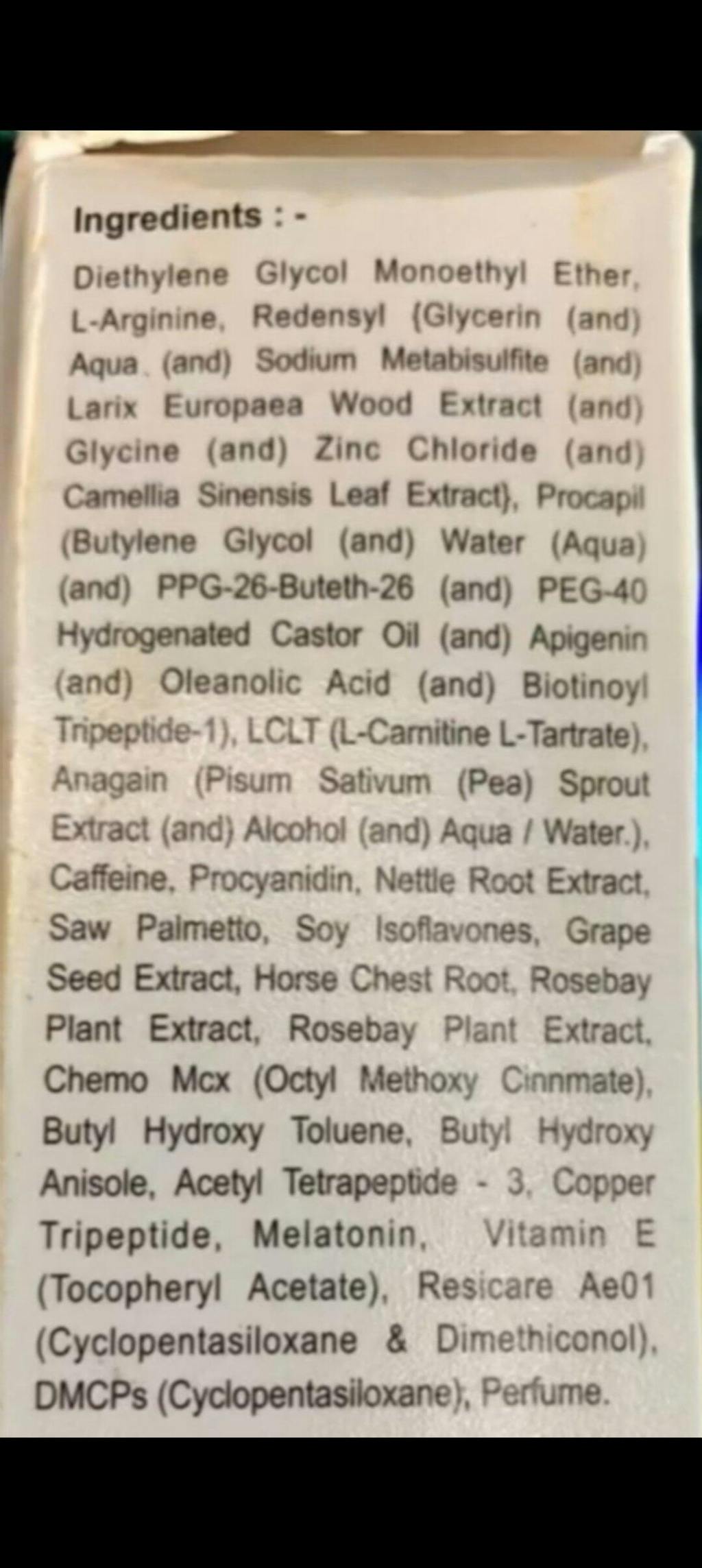 - Composition: Redensyl, Procapil, Anagain, Acetyl tetrapeptide-3 and 12 more molecules with penetration enhancer and anti-seborrheic factor.